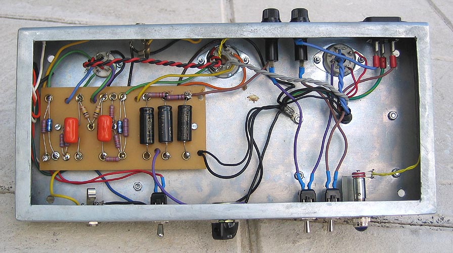 Una sola entrada de instrumento emulando la entrada "1" del original. La forma de "emular" os puede parecer curiosa. Lo lógico habría sido sustituir ese par de resistencias de 68K por una sola equivalente de 34K o más bien de 33K que es el valor normalizado más cercano. Lo hice así para poder cambiar fácilmente de un valor a otro. El resultado es que con 34K las pastillas singles suenan maravillosamente bien y ni con 68K suenan del todo bien las humbuckers de alta ganancia, así que he dejado las dos resistencias en paralelo y sólo uso el ampli con singles y humbuckers más "suaves". En las anteriores fotos de las placas aún no aparece la segunda resistencia pero más abajo podréis ver otra foto en la que se aprecia que sí que está puesta. Probad con las dos opciones. A mí personalmente me gusta más con las dos resistencias de 68K pues dá algo más de "alegría". Estrictamente hablando, el combo de una sola resistencia de 68K junto a la resistencia de 1M a masa no es exactamente igual que la entrada "2" del Champ original, que realmente era de 68K a la rejilla del primer triodo y 1M + 68K (la otra resistencia) a masa pero a efectos prácticos, esos 1.068M equivalen al 1M de aquí. Mirad el esquema original y veréis de lo que estoy hablando.