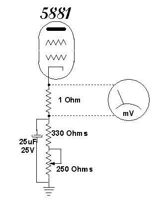 La resistencia de 330Ω y la de 1Ω han de ser de un mínimo de 2W. Esta última es para poder tomar medidas de corriente (mA) con un voltímetro en paralelo tal y como se ve en el dibujo y así no tener que usar un amperímetro que debería ir en serie. Mediante la ley de Ohm, lo que leamos en mV D.C. equivaldrá a mA D.C. Para calcular la medida correcta que debe dar en mV, usad esta fórmula: