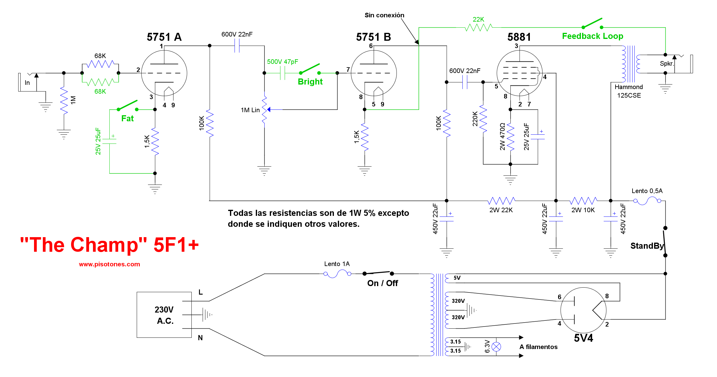 Como podéis ver en el esquema, es una versión actualizada y ampliada del Fender Champ 5F1 con unos notables añadidos: