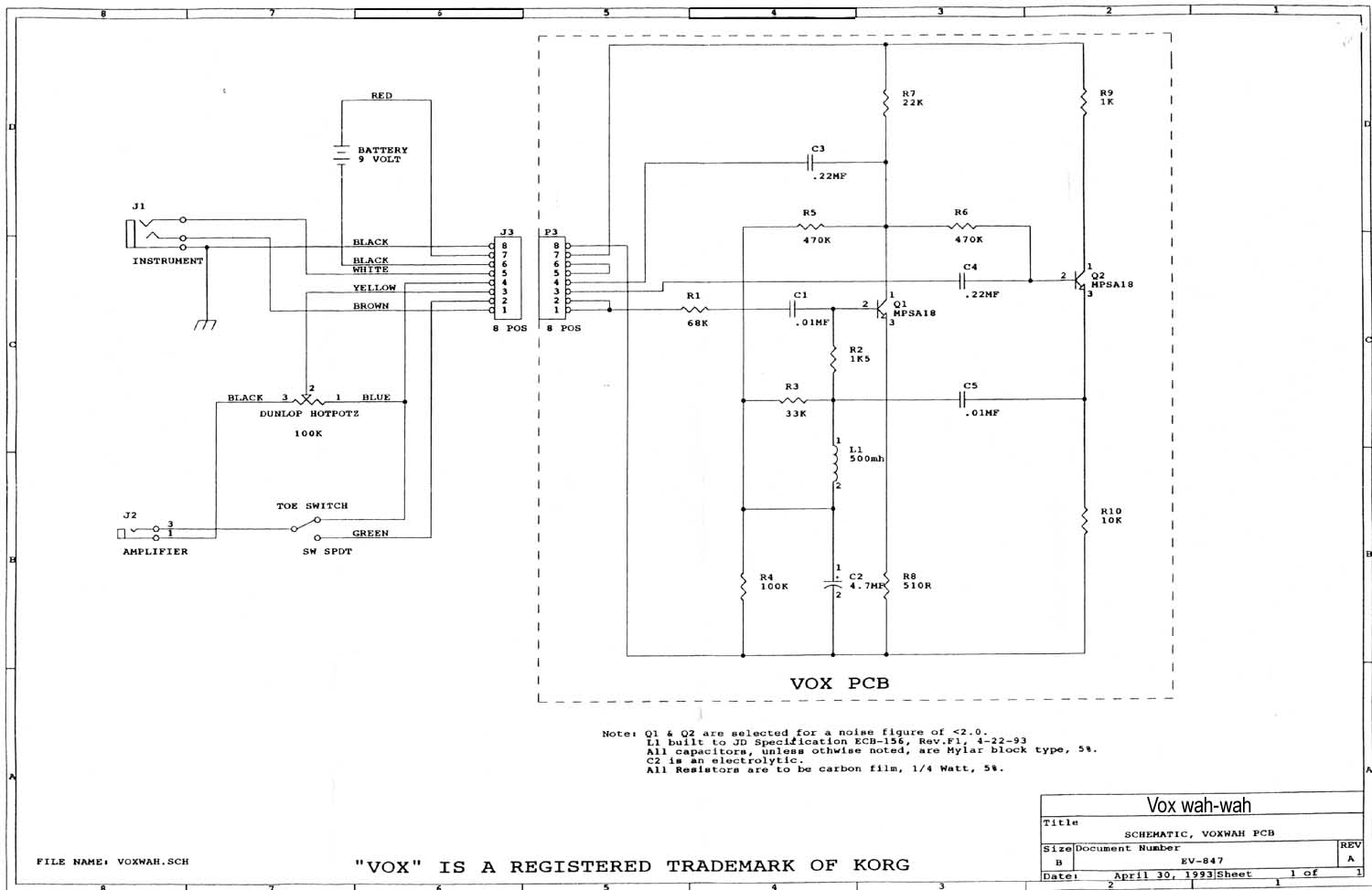 Era hora de releerse otra vez The technology of Wah Pedals. Al poco ya tenía pistas pero me puse a buscar opiniones de usuarios. (casi) Todo el mundo está de acuerdo en que suenan mejor los wahs "VOX" que los "Crybaby", por citar los dos estándares del mercado. El artículo de R.G. Keen estaba basado en los CryBaby. Total que me puse a buscar esquemas como loco. Encontré este esquema del wah VOX. Fijáos que se indica que el inductor "debe" ser de 660mH. ¡Que casualidad!... los inductores aunque nominalmente eran de 100mH, una vez medidos daban unos 110mH, lo que hacía un total de 660mH exactamente. Sin embargo, en la estupenda página Wah Wah Mods se insinúa que los buenos son de 500mH, por lo que seguí mi búsqueda y me encontré con el siguiente esquema auténtico de wah-wah VOX de 1993 en el que se indica claramente que el inductor es del 500mH, al igual que en este esquema de wah-wah VOX de 1980 . Así que decidí quitar uno de los seis inductores y dejarlo en cinco, dando un total de aproximadamente 550mH. El resultado fué de lo mejor, ahora sí que sonaba el wah como tenía que sonar, muchísimo más "orgánico" y "vocal" que antes, más "gordo" y gruñon. ¡Espléndido!.