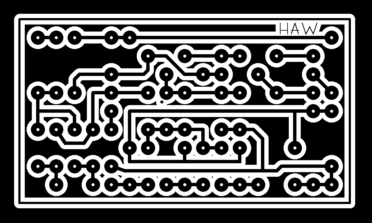 ¿Véis arriba a la derecha que pone "HAW"?. No es un saludo comanche, es "WAH" al revés, para indicaros de qué lado debéis poner la transparencia para que al final en el cobre quede escrito como es debido. También prestad atención al esquema del inductor. Viene reflejado el "punto" de comienzo de bobina que os contaba antes, justo entre las resistencias de 1K5 y 33K.