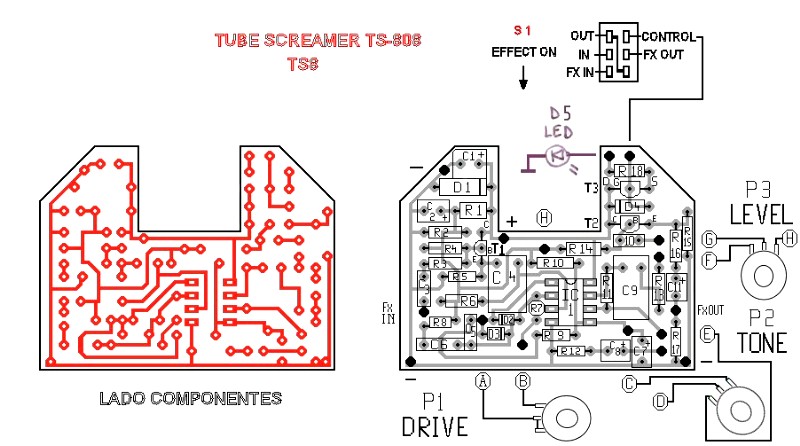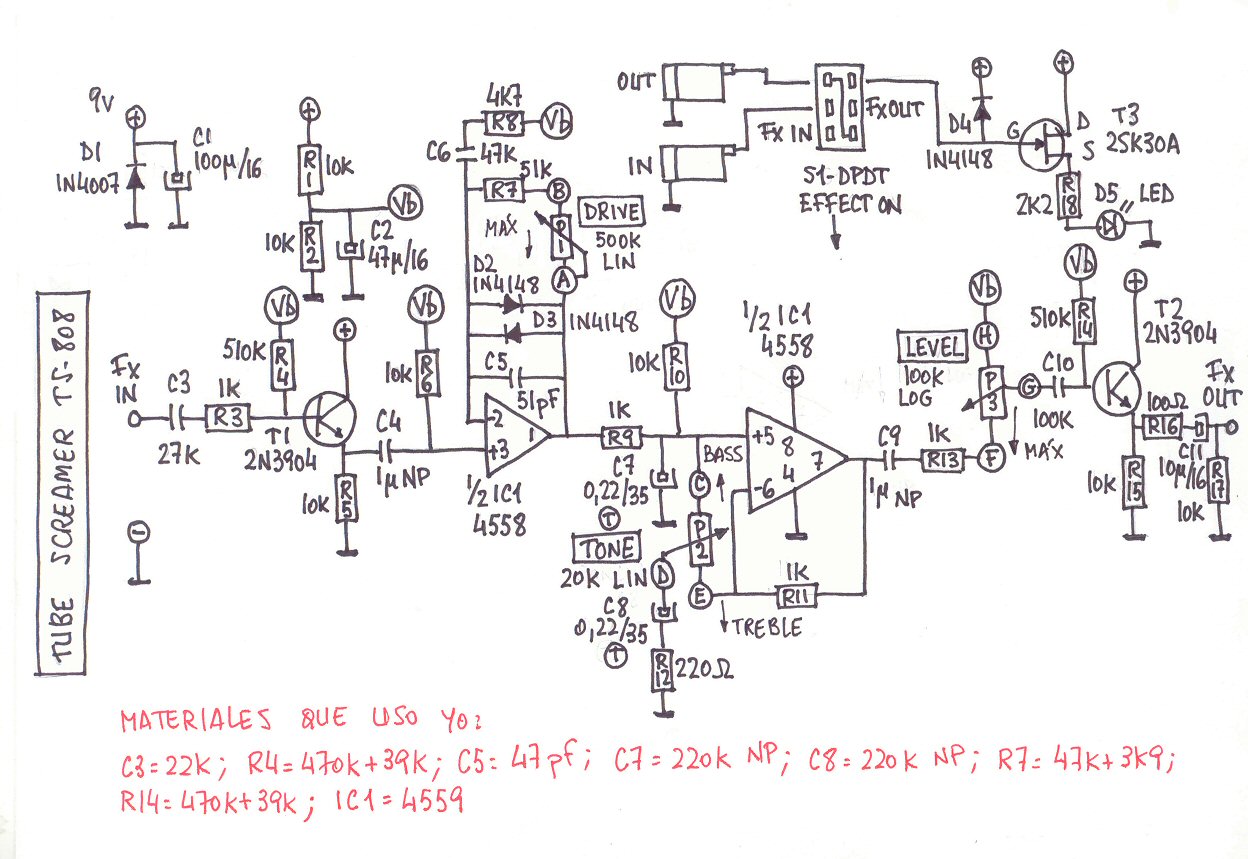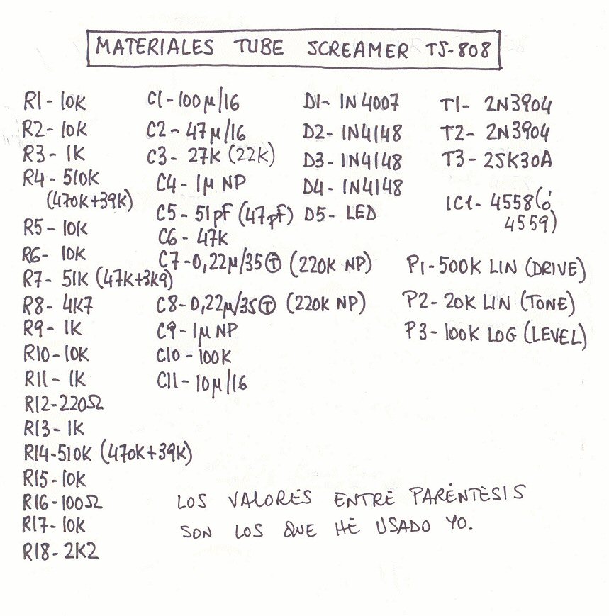 Cuando conocí esta página, allá por Julio del 2003, éste fue el primer proyecto que aparecía. No me había decidido a montarlo hasta ahora y he preferido dedicarme a otros proyectos más fiables. Con "fiables" me refiero a lo que supongo que os pasará a más de uno (o una, porque a todo esto, ¿hay alguna tía interesada en esto del pedaleo y que además toque la guitarra? Sería una sorpresa agradable, la verdad). Cuando encuentro muchas variantes del mismo efecto, diseños de placas que van desde las hechas con esas que vienen ya perforadas hasta las hechas en dos trozos que luego hay que unir entre sí, comentarios sobre el circuito en el que ponen alguna de sus partes a vuelta de perejil (como pasa con el control de tono del Tube Screamer), todos estos factores me crean una gran inseguridad ciudadana.