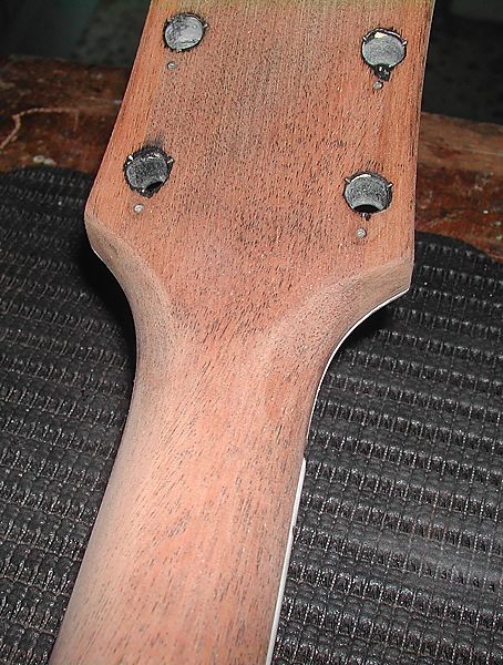 Durante el largo proceso de lijado se pudo comprobar que el barniz nitrocelulósico original había desaparecido por completo en el anterior lijado, pues bajo el poliuretano solamente había un aparejo gris para cerrar el poro de la caoba. Una chapuza. No quedaba más remedio que quitarlo todo y dejar que la nueva nitro permitiera vibrar y respirar de nuevo a esa madera tan noble, que estaba plastificada en barniz de poliuretano.