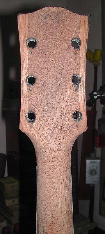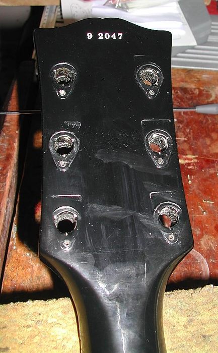 A continuación os pongo un par de fotos de la trasera de la pala. La primera, ya vista antes más arriba, es tal y como estaba pintada en poliuretano y con el número de serie tipo "Letraset". A continuación la pala ya lacada en nitrocelulosa, con los clavijeros ya instalados y con el número de serie hecho, como ya vimos, con un tampón con la fuente correcta, respetando el modo de hacer de esa época: