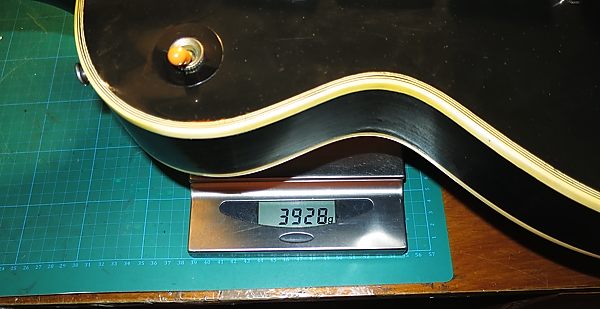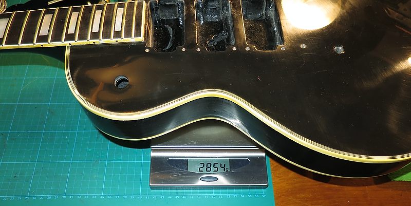 Una vez completamente lacada la guitarra de nuevo en nitrocelulosa, retrasteada y antes de poner ningún hardware, fijáos bien en la siguiente foto. En ella se ve el peso de la guitarra tal cual, sólo madera y poco más: