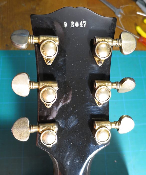 El clavijero es un Grover "Pat. Pend. U.S.A." Rotomatic 102-G (G de Gold) original, un clásico de las guitarras Gibson de alta gama de esa época.