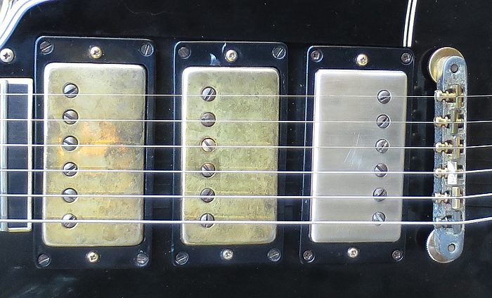 Curiosamente, los tornillos de anclaje de los marcos, siendo originales, son diferentes entre sí. Los de las dos primeras pastillas son para destornillador de punta plana y los de la pastilla de puente son tipo estrella (phillips), siendo esto normal en estas guitarras en esta época.
