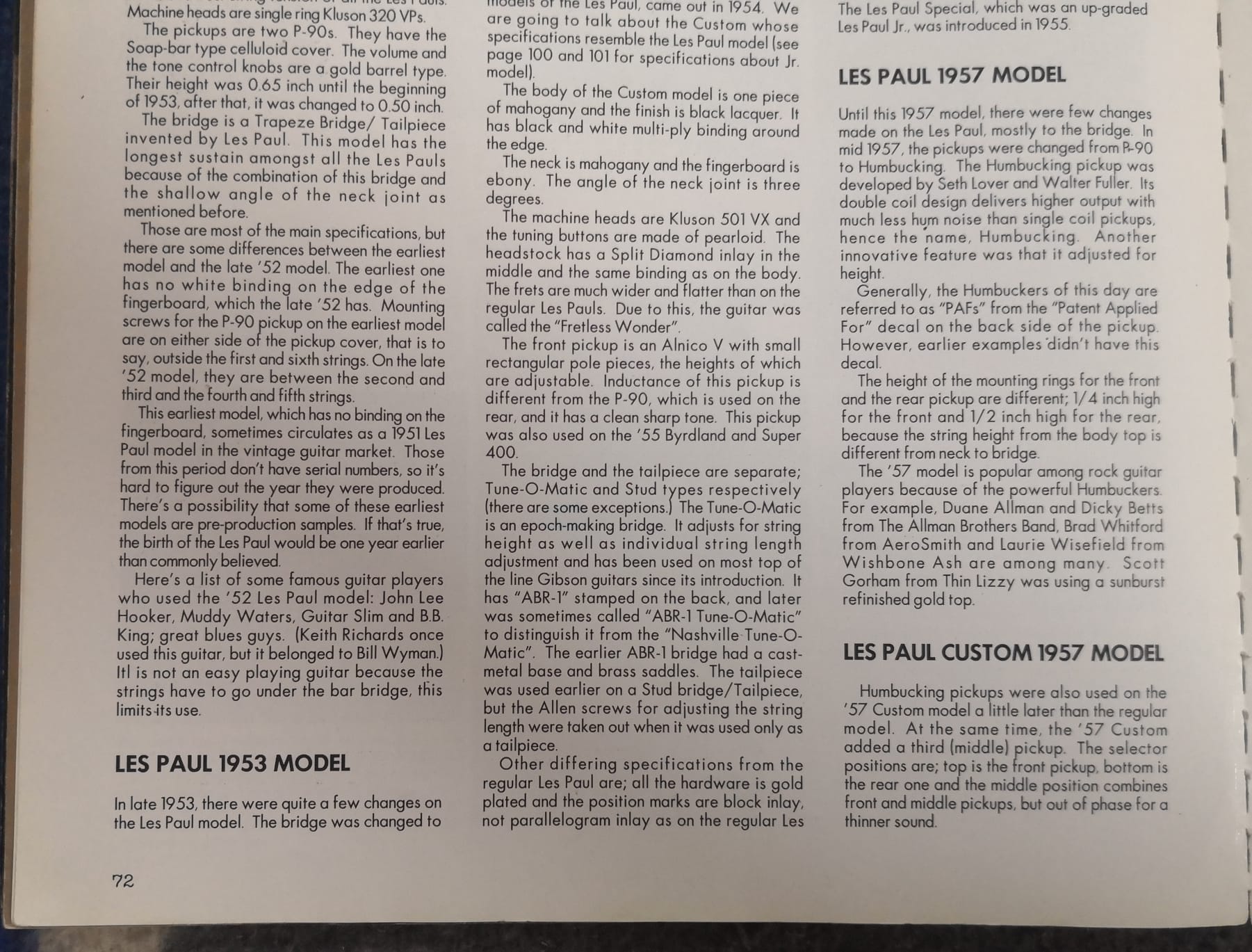 La pastilla del centro está fuera de fase con respecto a las otras dos, tal y como venía de fábrica, produciendo un sonido característico que a no todo el mundo le agrada. Mucha gente giraba la pastilla del centro para conseguir un sonido más estándar, pero en esta se respeta la configuración original que aparece en los catálogos de la época. En el Catálogo de Gibson de guitarras del año 1959 podéis leer, en la página G·15, que la guitarra venía originalmente así. Curiosamente en ese catálogo no aparece la "burst" típica de este año y el anterior (y el siguiente) y sí que aparece la foto de una tipo 1956 (Goldtop con tune-o-matic y P90s) con el texto de una 1957 (humbuckers). Si buscáis las Customs de 3 pastillas de los '50 en google podréis ver que a muchas le han invertido la pastilla del centro para intentar hacer el sonido intermedio más "normal". Esta solución rápida mitiga un poco el problema pero para corregirlo del todo habría que, al menos, abrir esa pastilla y modificar la posición del imán.